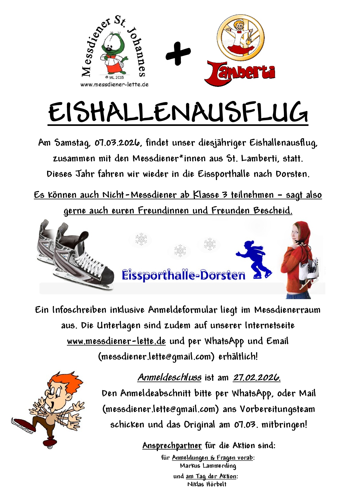 auch in diesem Jahr bieten wir zusammen mit den Messdiener*innen der Pfarrgemeinde St. Lamberti einen gemeinsamen Eishallenausflug an. In diesem Jahr fahren wir wieder in die Eissporthalle nach Dorsten.😊 Auch Nicht-Messdiener*innen können gerne teilnehmen.