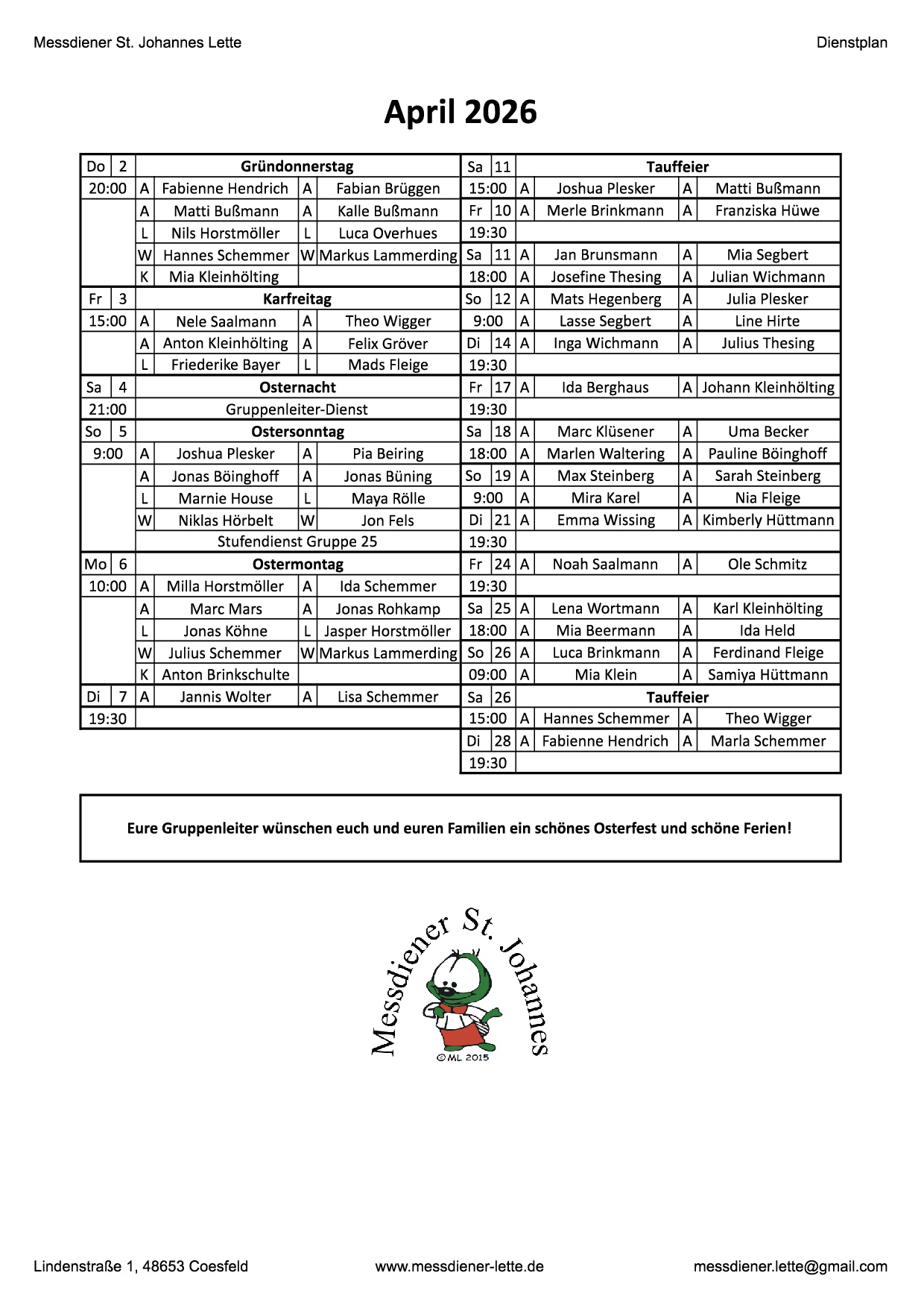 Hier bekommt ihr den Dienstplan für April 2026! 🎉